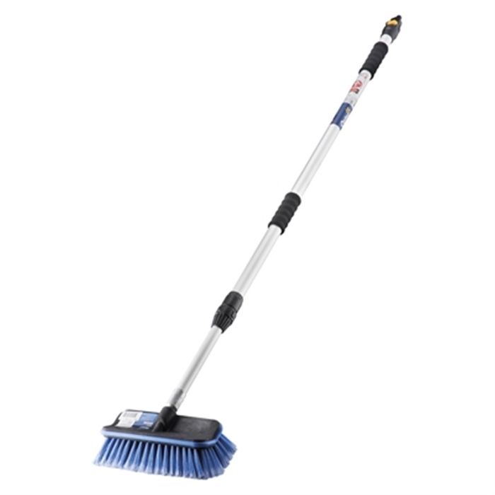 Ideal for cleaning vehicles, buildings etc Fine, soft, finely flagged bristles Water dispensing head, on/off value for easy water control Aluminium handle with non-slip comfort grip extends to 2.3m W270 X D150 + H1410 - 2390MM